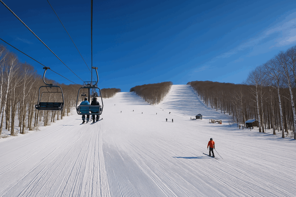 - リフト設備: ペアリフト2基、コース数8~9本、標高差約260m(山頂標高約430m)。初級40%・中級40%・上級20%程度の難易度構成。