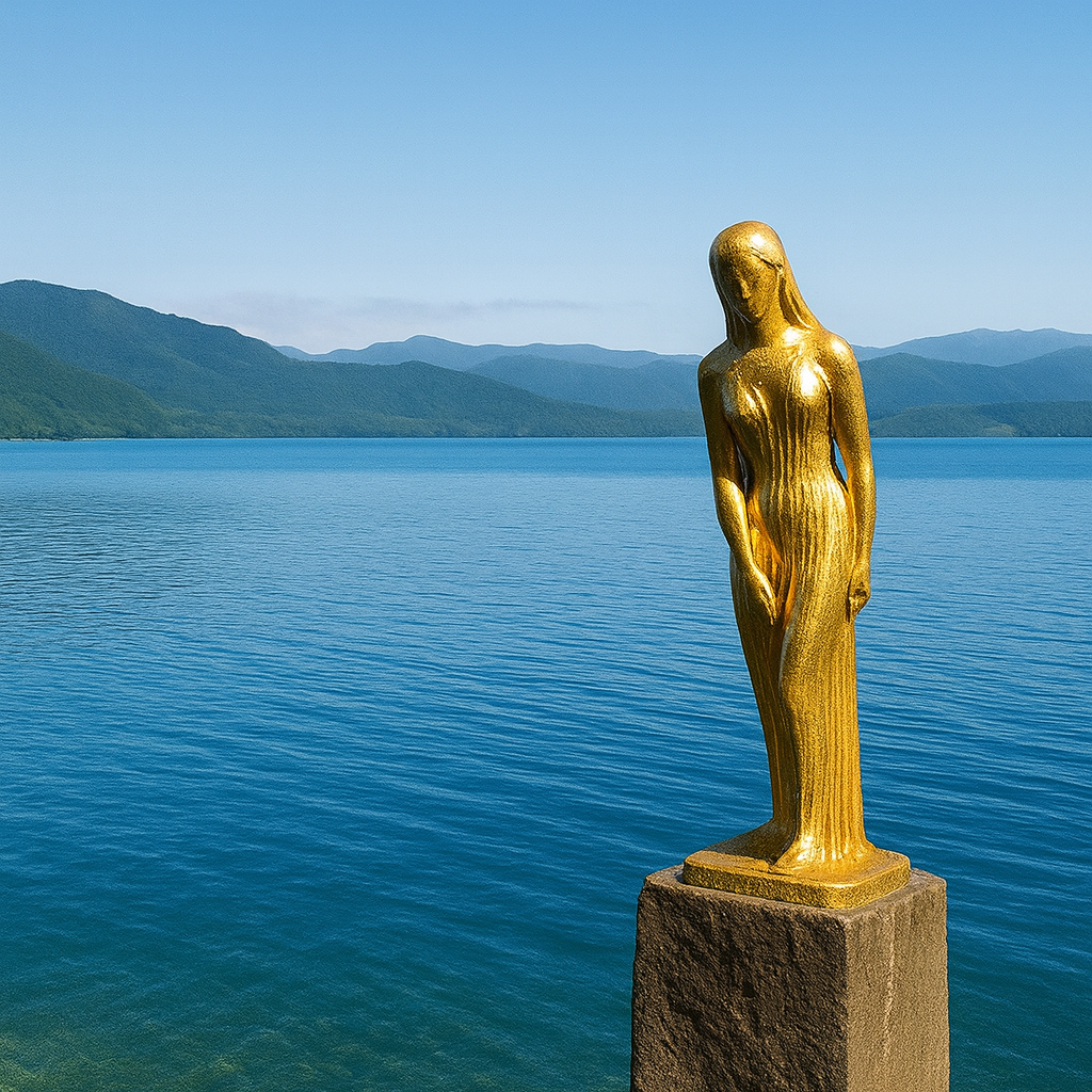 田沢湖と辰子姫伝説の象徴。湖の青に金色が映える家族写真の定番。 公式解説やライブカメラで当日の様子も確認できます。